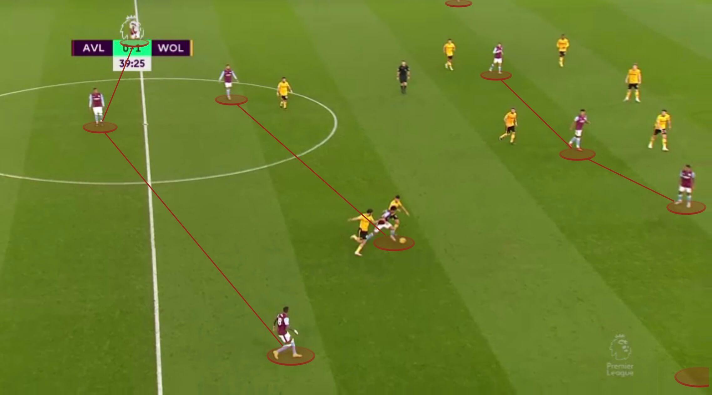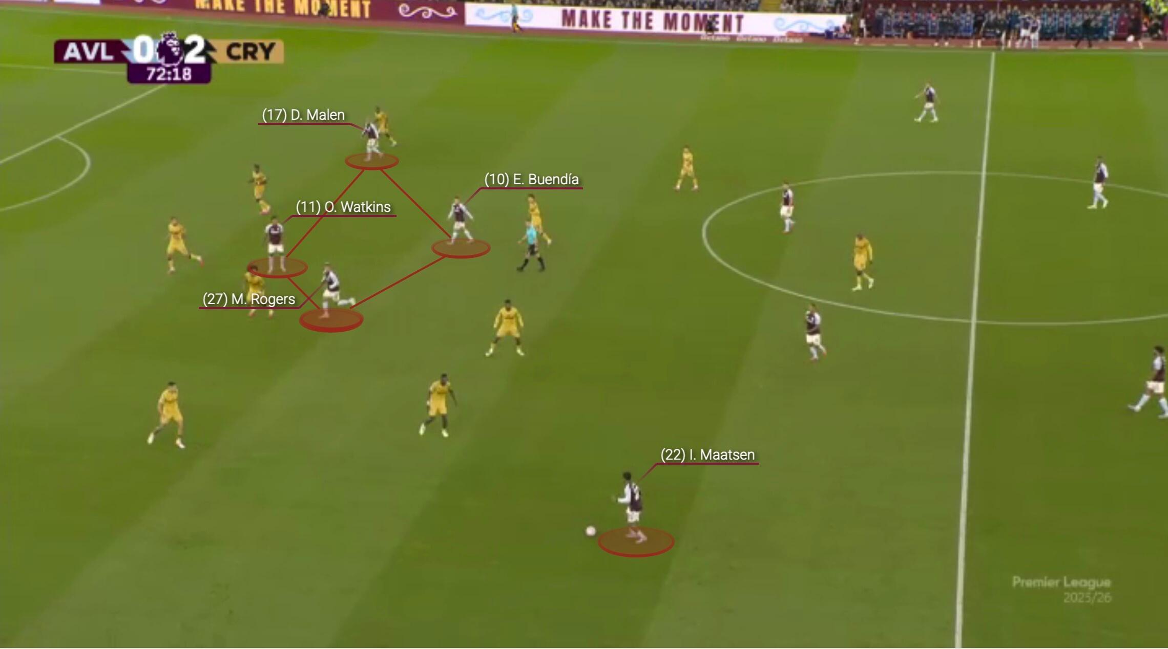 马伦有速度和直接性,但更倾向于内切跑动,而不是作为一个边路接应点。这在对阵水晶宫的下半场得到了验证,当时维拉的前场四人组几乎没有宽度可言。