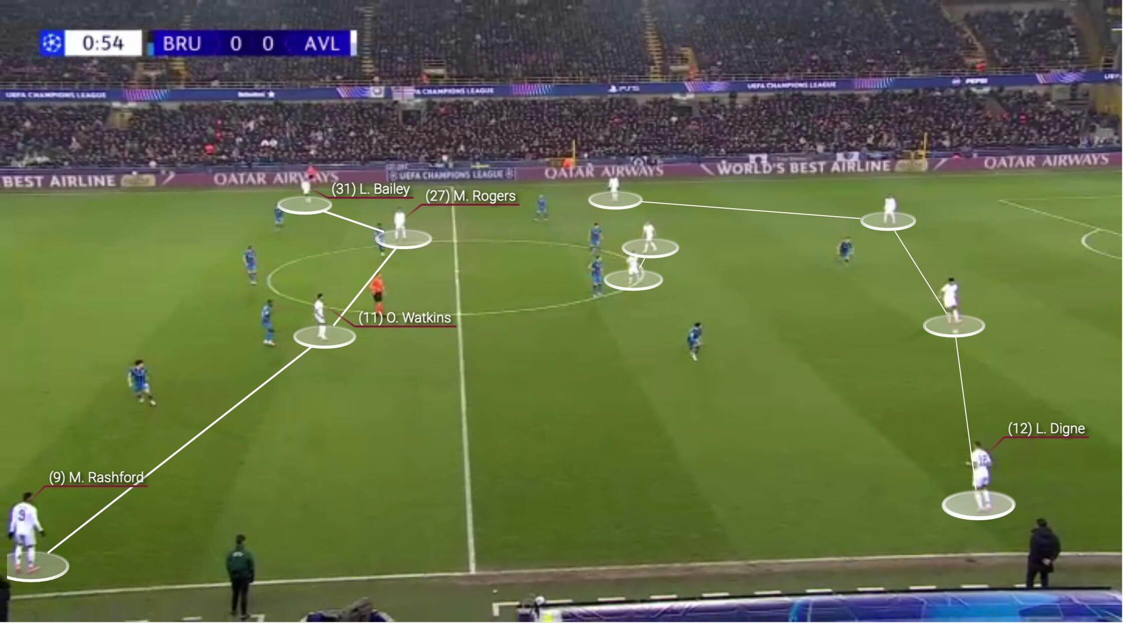 埃梅里会根据特定比赛调整战术。赛前分析是他的一大强项,他可以针对具体对手微调指令,而不是长期改变他的原则。在欧冠16强首回合对阵布鲁日的比赛中,埃梅里采用了4-2-4阵型,旨在利用利昂-贝利、拉什福德和沃特金斯的速度冲击布鲁日的防线,并利用比利时球队的人盯人防守体系进行突破。