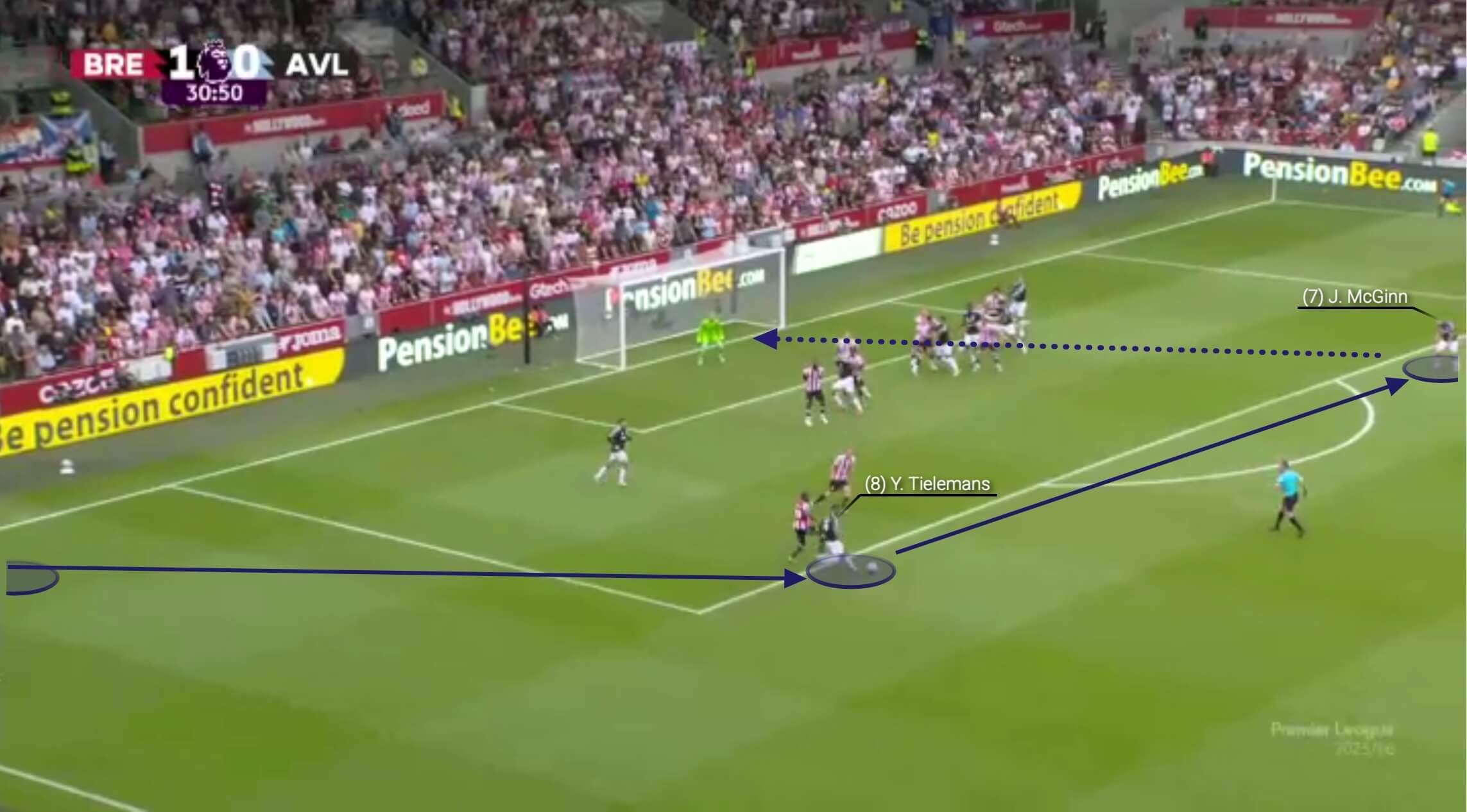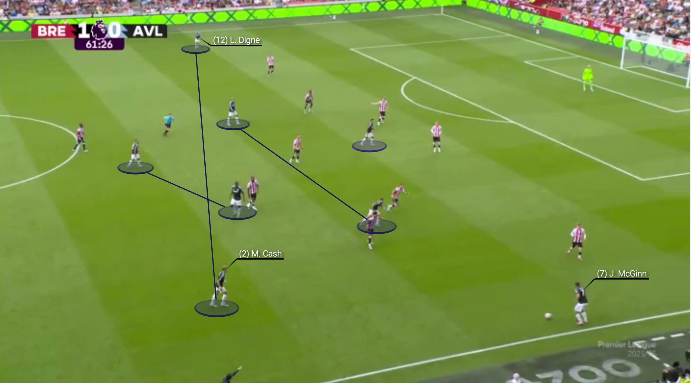 然而,最近这种对控制的追求变得过于谨慎,扼杀了进攻冒险精神。维拉在进攻组织阶段基本上仍然采用3-2-5阵型。这是8月对阵布伦特福德的比赛。